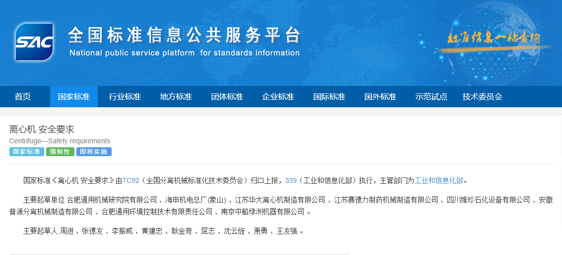 國家標準(zhǔn)《離心機 安全要求(qiú)》由TC92(全國分離機械(xiè)標準化技術委員會(huì))歸口上報(bào),339(工業和信息化部)執行,主管部門為(wéi)工(gōng)業和信息化部。