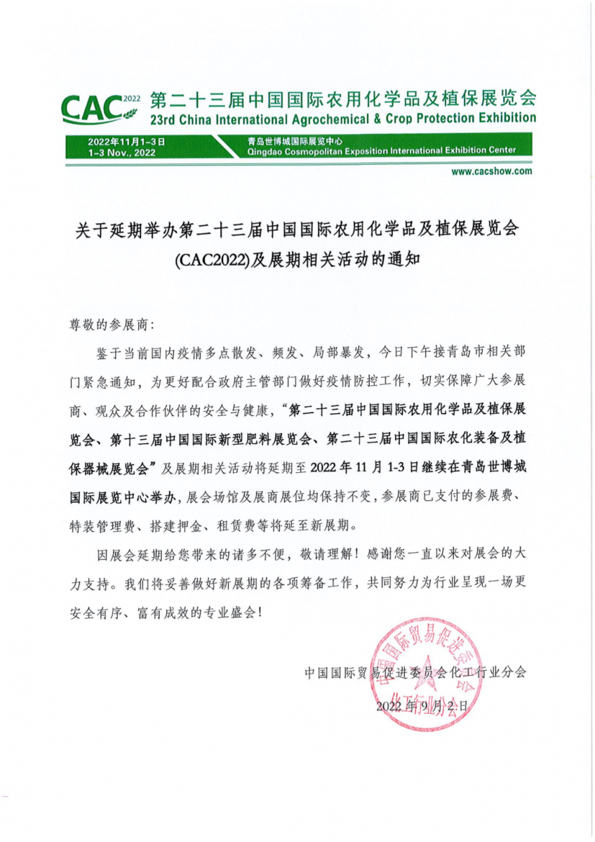 In view of the sporadic, frequent and local outbreaks of the epidemic in China, and the urgent notice received from relevant departments of Qingdao this afternoon, in order to better cooperate with competent government departments in epidemic prevention and control, and effectively guarantee the safety and health of exhibitors, visitors and partners, 23rd China International Agrochemical and Crop Protection Exhibition, 13th China International Fertilizer Show, 23rd China International Agrochemical and Crop Protection Equipment Exhibition, and related activities will be postponed to be held on November 1-3, 2022 in Qingdao Cosmopolitan Exposition International Exhibition Center, exhibition venues and exhibitors booths are unchanged.