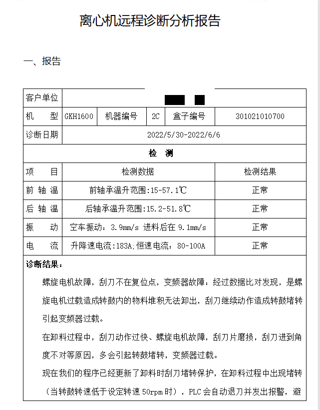 診斷中心將故障(zhàng)分析報告及解決(jué)方法發給客(kè)戶,並確認故障。同時,給出該設備“若不及時更新(xīn)保護程序(xù),可能會引(yǐn)發刮刀(dāo)軸損壞(huài)”的(de)預警。診斷平台第一時間(jiān)聯係用戶,增加了螺旋電機電流和主機電流檢測裝置,當螺旋電機電流過大會放慢刮刀速度,避免螺旋電機堵轉;當主機(jī)電流(liú)過大時,刮刀自動暫(zàn)停,避免刮刀軸(zhóu)損壞。目前(qián)該離心機運轉正常。