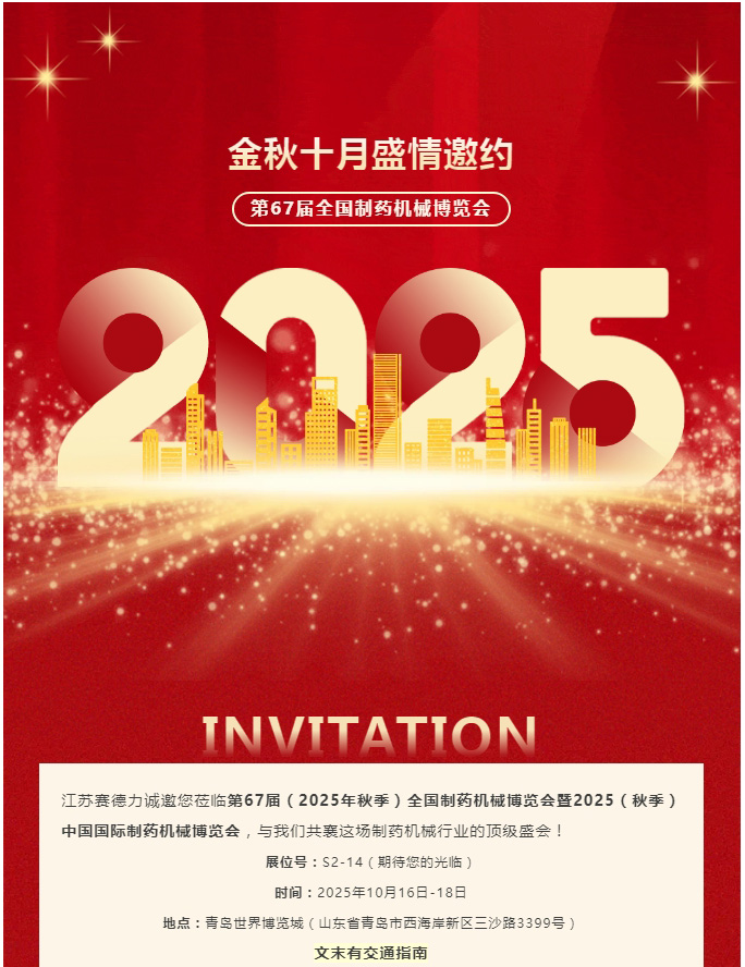 盛秋之約 |江蘇賽(sài)德力與您相約(yuē)第67屆(2025年秋季)全國製藥機(jī)械博覽會暨2025(秋季)中國國際(jì)製藥機械博覽會